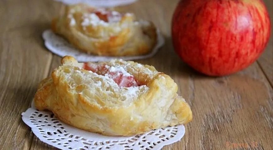 - Ингредиенты: 250 г слоеного теста, 2 яблока, 50 г сахарной пудры, 1 яйцо.