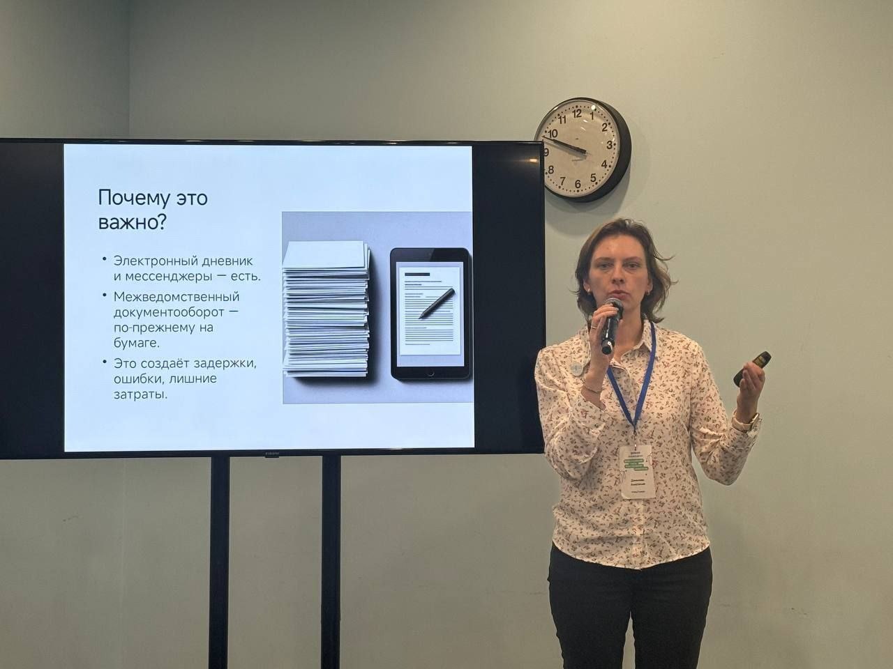 «В первый день мы участвовали в панельных дискуссиях на различные темы, в проектных группах по разным направлениям. В своем выступлении я поделилась проблемами и перспективами организации электронного документооборота в российских школах, что вызвало интересную дискуссию.Второй день Съезда был посвящён награждениям и открытым диалогам с приглашёнными гостями. Самые живые и интересные, вызвавшие овации и огромное количество вопросов из зала, - с Карелиным А.А., трёхкратным победителем Олимпийских игр, и Олешко А.В., актером театра и кино. Гостей зал провожал стоя.