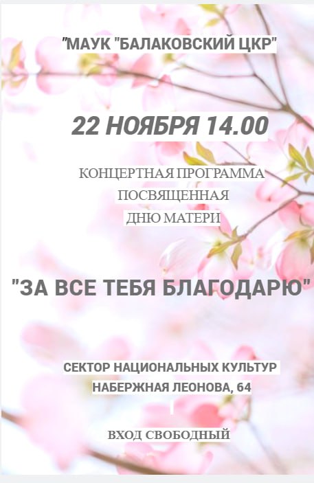22 ноября в 14:00 в секторе национальных культур Балаковского центра культурного развития пройдет праздничная концертная программа, посвященная Дню матери под названием «За все тебя благодарю».