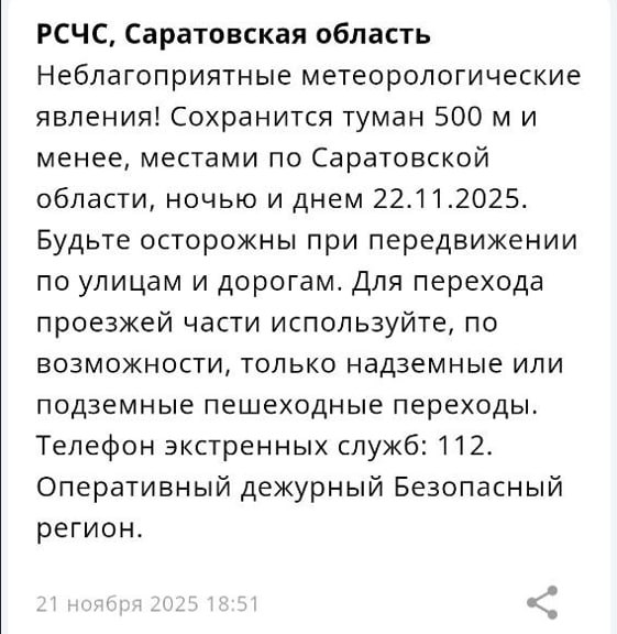 Экстренная информация РСЧС*:Сохранится туман 500 м и менее, местами по Саратовской области, ночью и днем 22.11.2025, — сказано в уведомлении от МЧС.