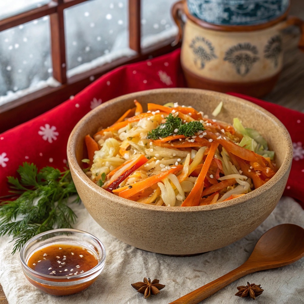 - Приготовление: Капусту нарезать тонкими полосками, морковь натереть на крупной тёрке. Овощи обжарить с чесноком на растительном масле, затем перемешать с заправкой и дать настояться. Подается тёплым, украшенным зеленью.