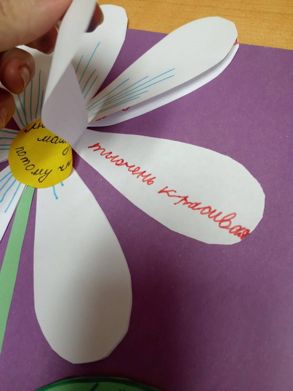 Дети создают открытки своими руками, чтобы выразить любовь и благодарность самому дорогому человеку. В центре цветка на каждом лепестке они написали искренние слова о том, за что любят свою маму.
