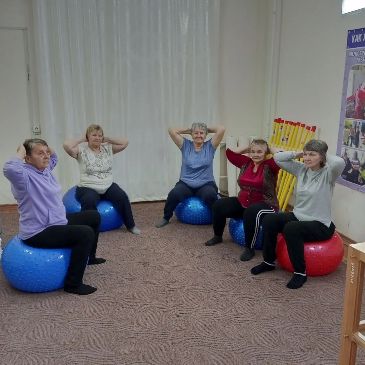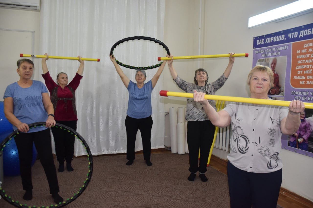 Получатели социальных услуг, участники группы здоровья «Вдохновение» с удовольствием занимаются адаптивной физкультурой в спортивном зале.