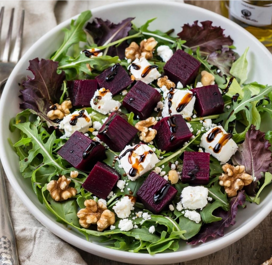 Этот салат — настоящий гастрономический шедевр, где сладковатая запеченная свекла сливается с пикантным козьим сыром, а хрустящие орехи завершают вкусовую композицию. Это простое, но в то же время элегантное блюдо станет ярким акцентом любого застолья и порадует даже самых требовательных гурманов.