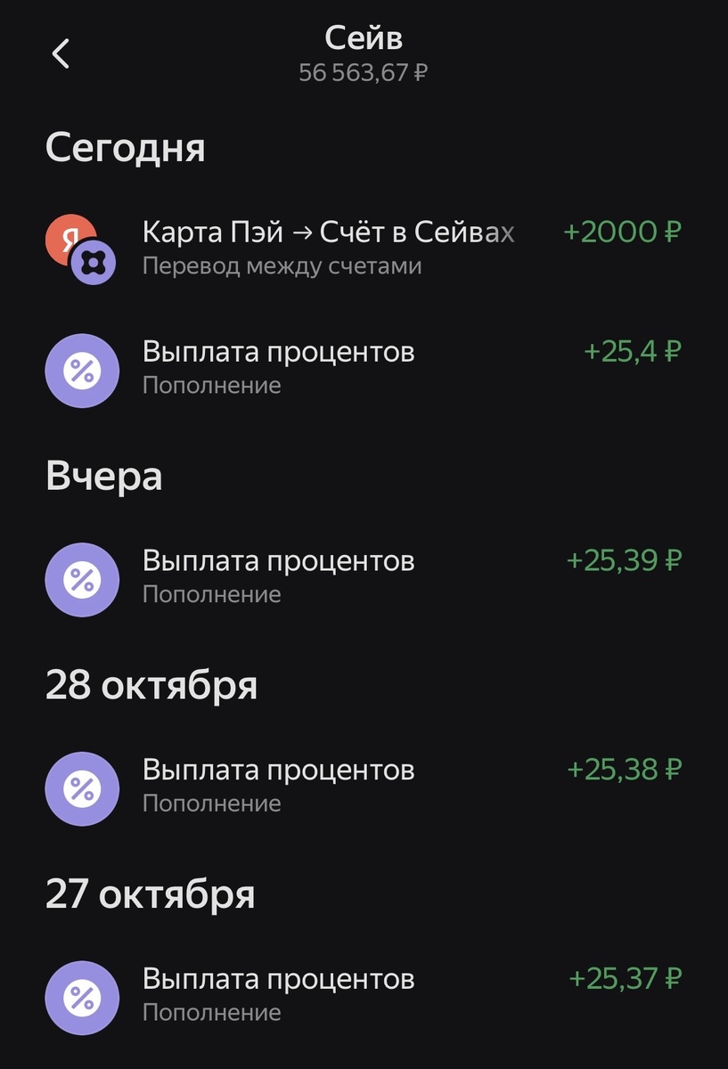 Накопительный счет «Сейв» в Яндекс банке, открытый в сентябре, активно используется. В октябре 2025 года заканчивается период действия приветственной ставки в 17% годовых. Учитывая быстро приближающийся срок, стоит рассмотреть возможность переоформления счета или же оставить средства под более низкий процент. С учетом роста средств, накопления на данный момент достигли 56 563,67 евро.