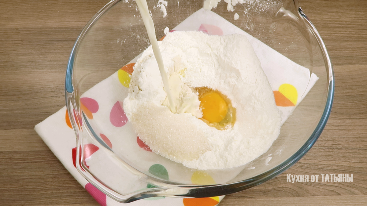 Для начала необходимо подготовить основу для теста. В глубокой миске смешивают заранее просеянную пшеничную и рисовую муку вместе с кукурузным крахмалом, добавляют сахар, ванильный сахар и небольшую щепотку соли. Затем разбивают в смесь одно яйцо и добавляют молоко.