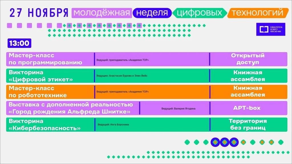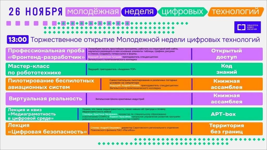26 ноября в 13:00 и 27 ноября в 13:00 в Центральной модельной библиотеке г. Энгельса стартует III Всероссийская акция «Молодёжная неделя цифровых технологий».