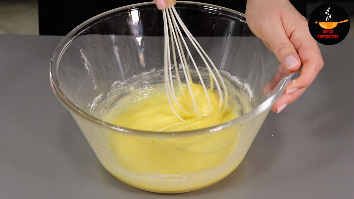 В глубокой миске разбивается яйцо. К нему добавляются сахар и ванильный сахар, затем щепотка соли. Все тщательно взбивается венчиком до получения однородной массы. В смесь вливается растительное масло, после чего добавляются сухие ингредиенты: кукурузный крахмал, просеянная мука и разрыхлитель. Тесто замешивается, образуя рыхлую массу, а затем вводится сметана. В результате образование однородного, эластичного теста, не прилипшего к рукам.