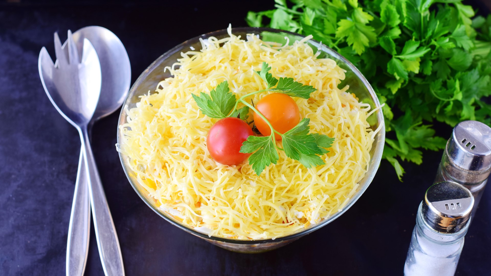 Выложите салат слоями в следующем порядке: печень, грибы, яйца, сыр. Каждый из них смажьте майонезом, делится портал Russian Food.