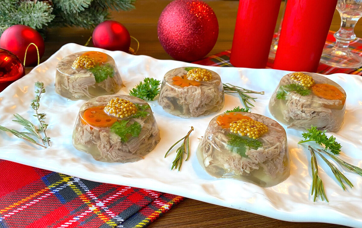 Отделяем мясо от костей и укладываем его на блюдо, добавляя любимые украшения, а затем заливаем бульоном.