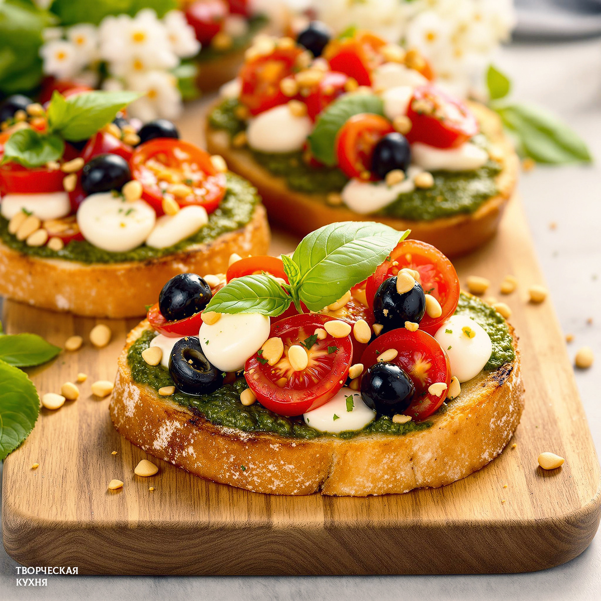 После этого хлебцы покрываются соусом песто, а сверху выкладывается подготовленная начинка. Не забудьте посыпать кедровыми орешками и украсить свежими листочками базилика. Подача готова – такой ужин или закуска не оставит равнодушным ни одного гурмана.