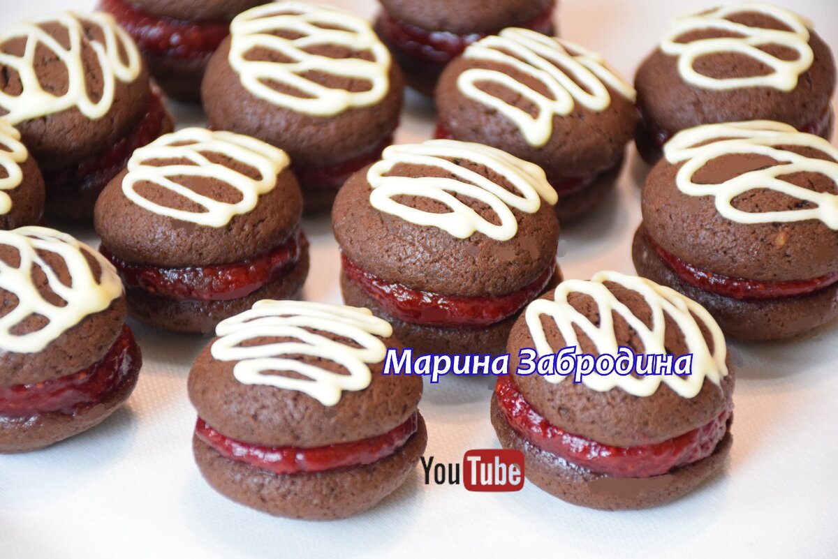 Получившееся тесто перекладывают в кондитерский мешок и отсаживают на противень, формируя небольшие бисквиты. Выпекать в заранее разогретой духовке на 180 градусов около 7 минут. Готовые пирожные наполняются клубничной начинкой и прикрываются второй половинкой. Завершающим штрихом станет украшение белым шоколадом.