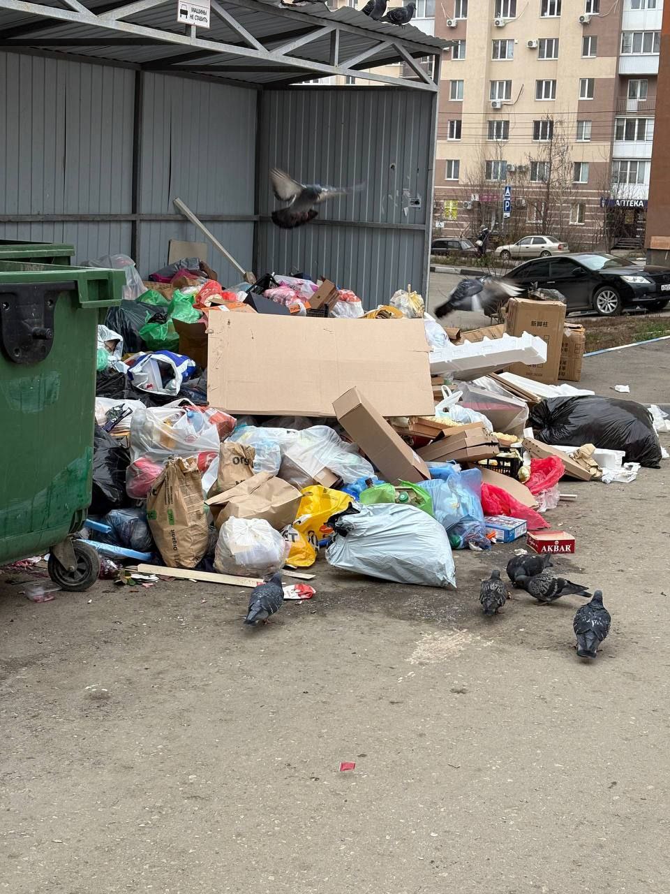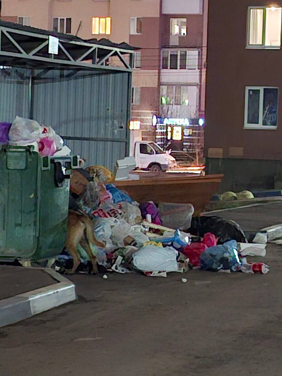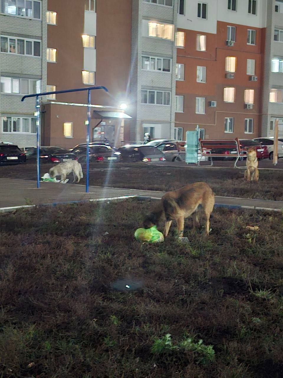 В Саратове на улице Панченко, 3 разбросанный мусор и стаи диких собак, в том числе, и на детской площадке.