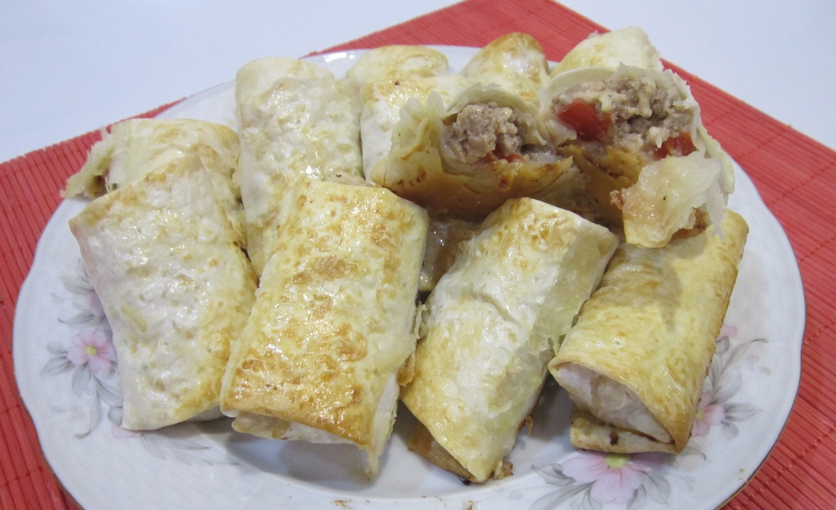 Лаваш нужно нарезать на прямоугольные кусочки размером примерно 20 на 25 см. На край каждого листа выкладывается столовая ложка начинки, после чего рулетики заворачиваются. Чтобы они не развернулись при готовке, их аккуратно укладывают в смазанную маслом форму для запекания.