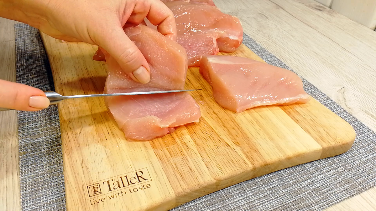 Куриное филе необходимо отварить и нарезать тонкой соломкой. Яйца взбиваются и жарятся в блинчики. В миске смешиваются куриное филе, нарезанный лук, пекинская капуста и ломтики блинчиков. Все заправляется майонезом и сметаной для нежности.