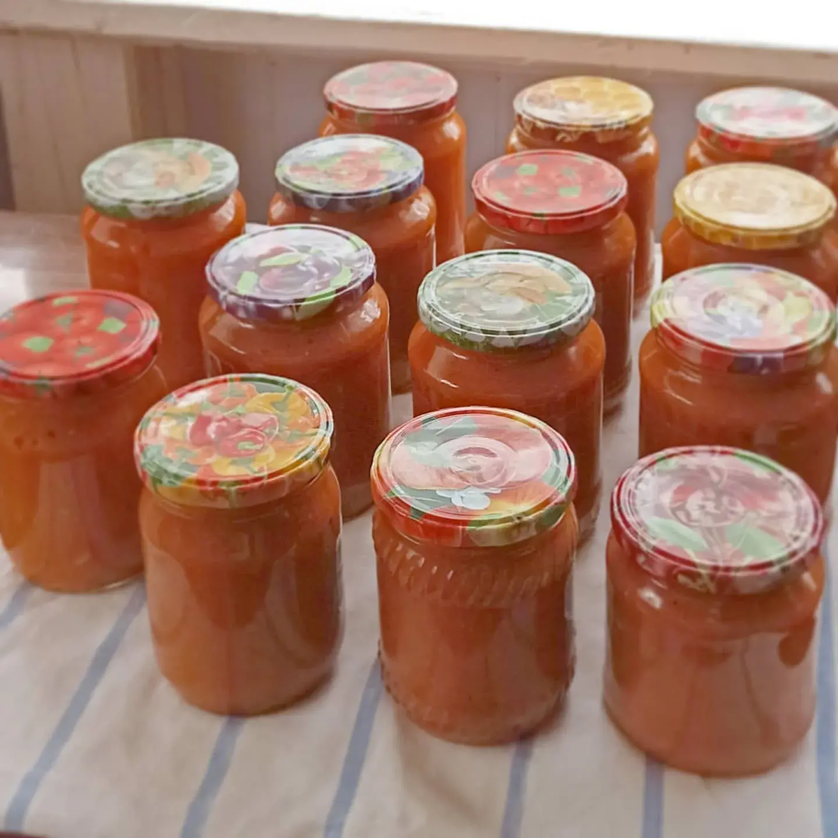 Когда время вышло, вводится томатная паста и все остальные специи. Доведите до кипения, затем используйте погружной блендер для пюреобразования массы. В завершение добавьте уксус, тщательно прокипятите и разложите по стерилизованным банкам. Закатайте крышки и дайте остыть.