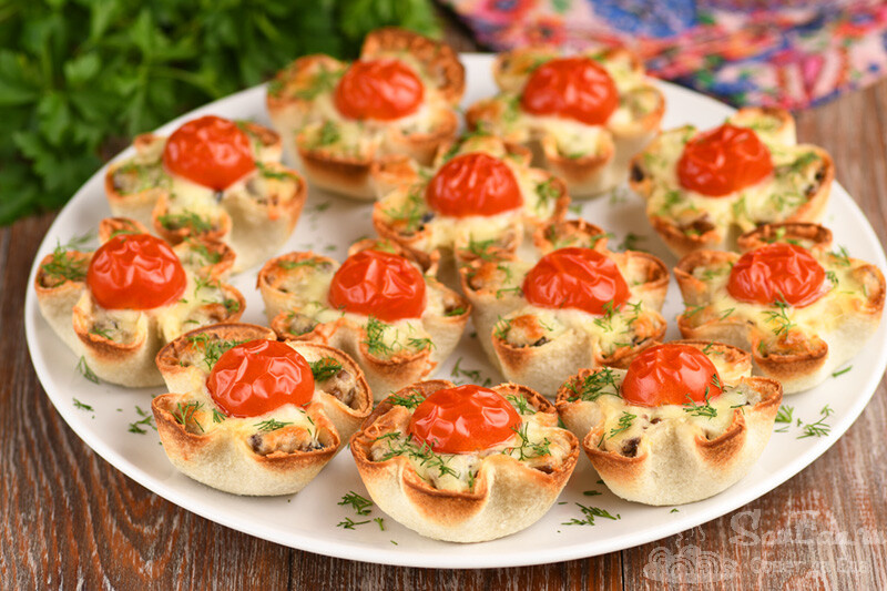 Не обойтись на праздничном столе и без корзиночек с грибами. Шампиньоны с луком обжариваются до испарения жидкости, а затем к ним добавляют сметану и немного мускатного ореха для пикантности. Полученная начинка, дополненная натертым сыром и сладкими черри, станет отличным дополнением к любому застолью.