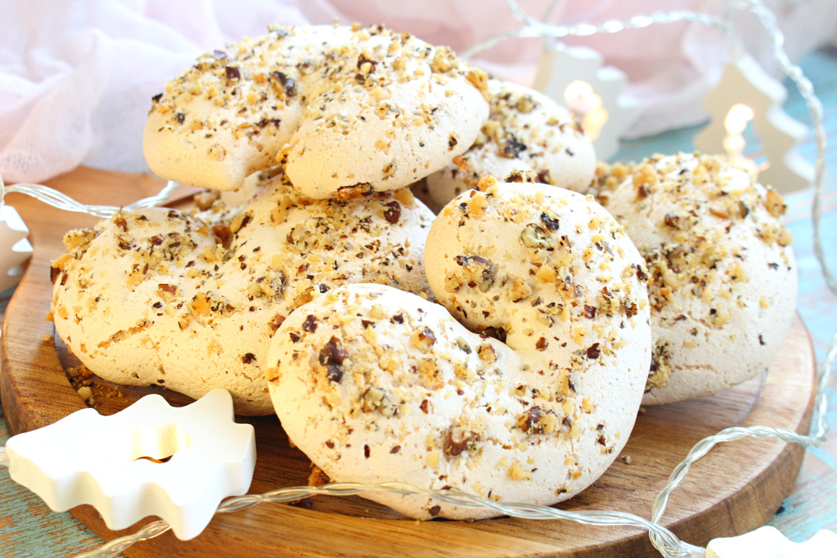 На следующем этапе в смесь добавляются заранее измельченные грецкие орехи. Их можно порубить ножом, прокатать скалкой или использовать блендер для более однородной текстуры. Затем следует подготовить противень: на него укладывается пергамент, после чего равномерно распределяются орехи в виде полумесяцев, на которые будет выложена меренга.