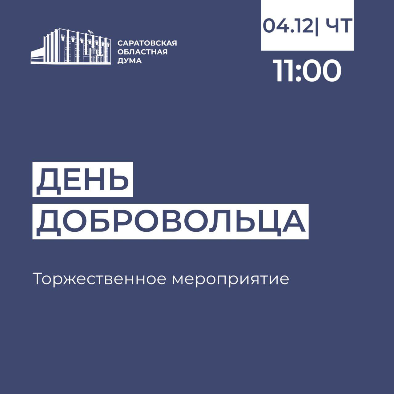 Сегодня, в преддверии Дня добровольца, в Саратовской областной Думе пройдет торжественное мероприятие.
