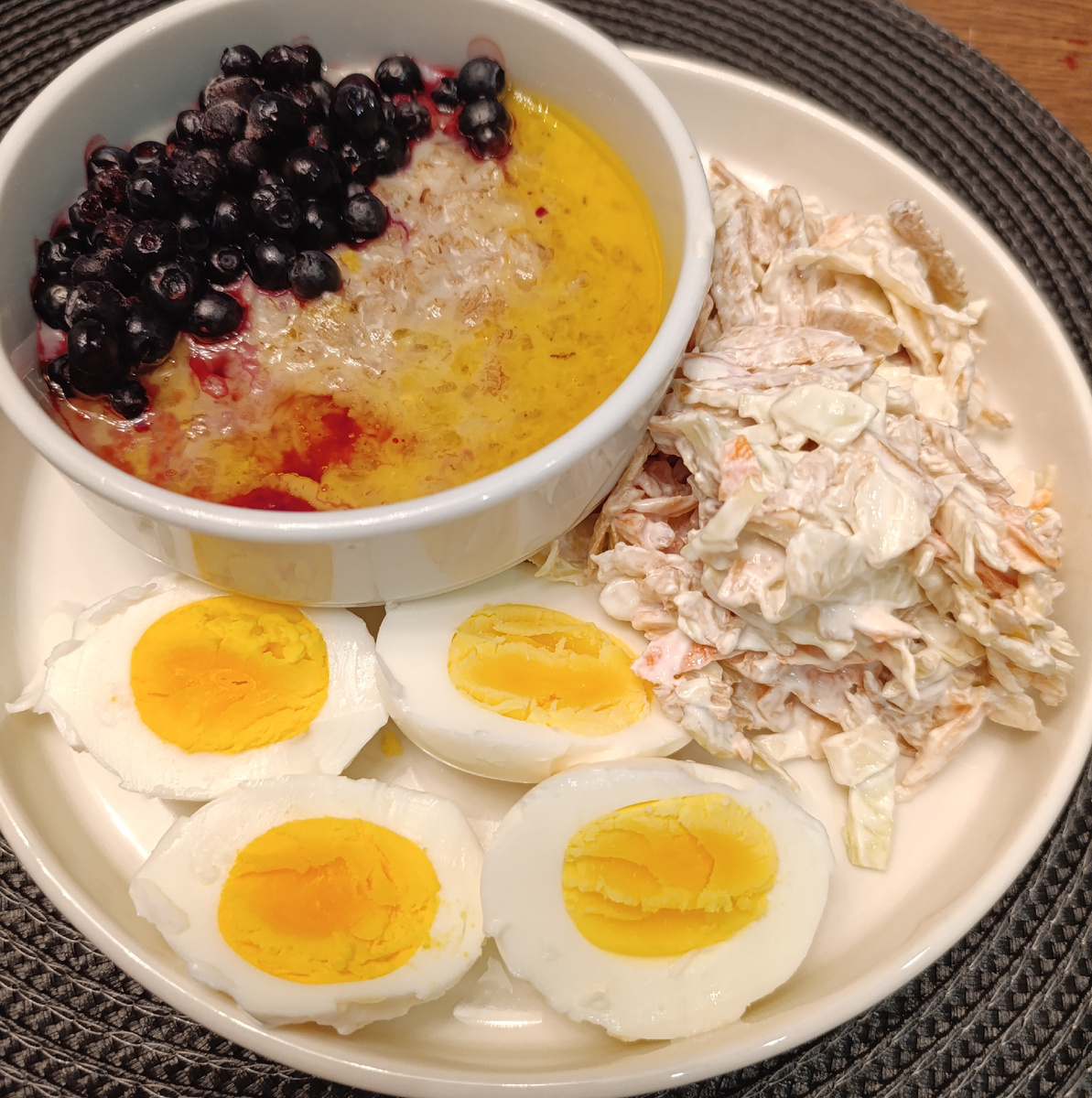 - Завтраки: В субботу — каша из пяти злаков с топлёным маслом и вареными яйцами, к обеду остались стейки шеи с макаронами и салатом из моркови.