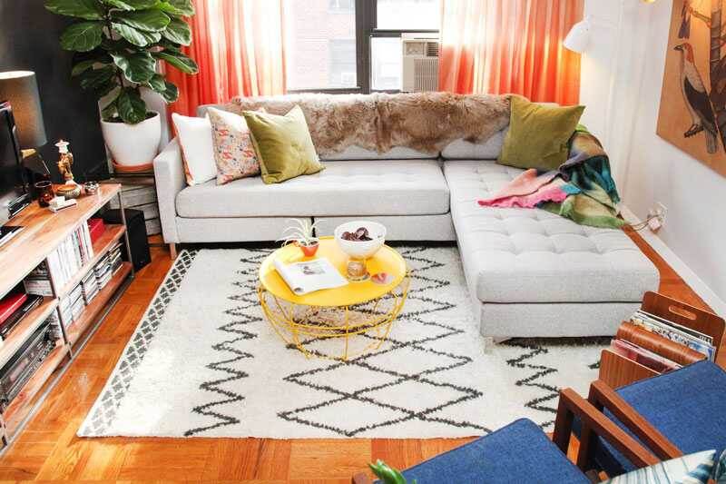Выбор материала ковра также играет немалую роль. Гостиная — это одно из самых посещаемых мест в доме, где проводятся времени с детьми и домашними питомцами. Поэтому стоит избегать дешевых и ненадежных материалов и инвестировать в качество. Шершавая шерсть — отличный выбор, поскольку она не только прочная, но и приятная на ощупь.