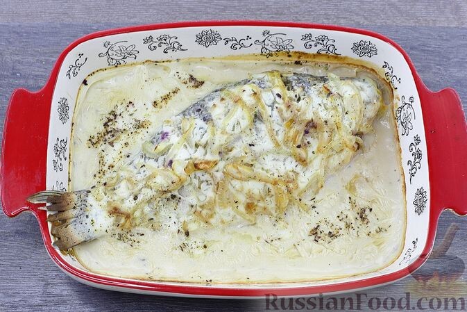 - Карась, запечённый с луком и сметаной — идеально подходит как для обеда, так и для ужина. Рыба, обжаренная до золотистой корочки и поданная с нежным сметанным соусом, порадует любого гурмана.