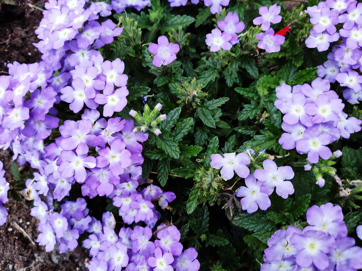 - Вербена гибридная — это невысокий цветок (20-30 см) с яркими и разнообразными оттенками. Завораживает своим цветением с июля по октябрь. Она неприхотлива и способна выдерживать небольшие заморозки. Однако предпочитает солнечные места.