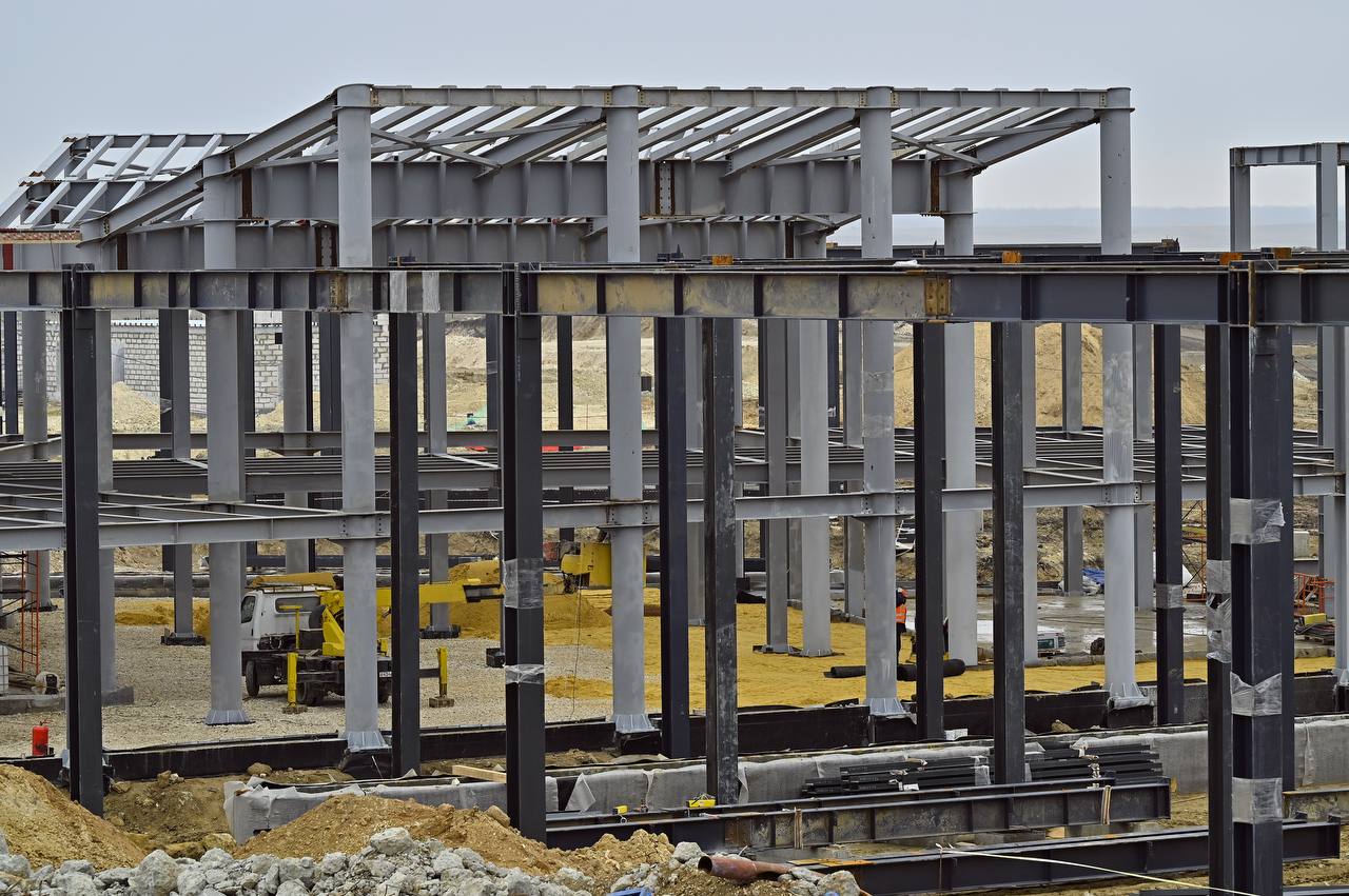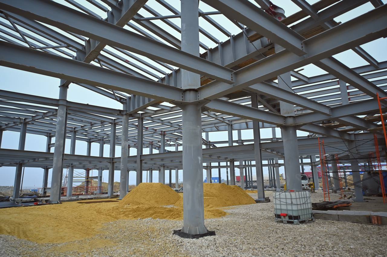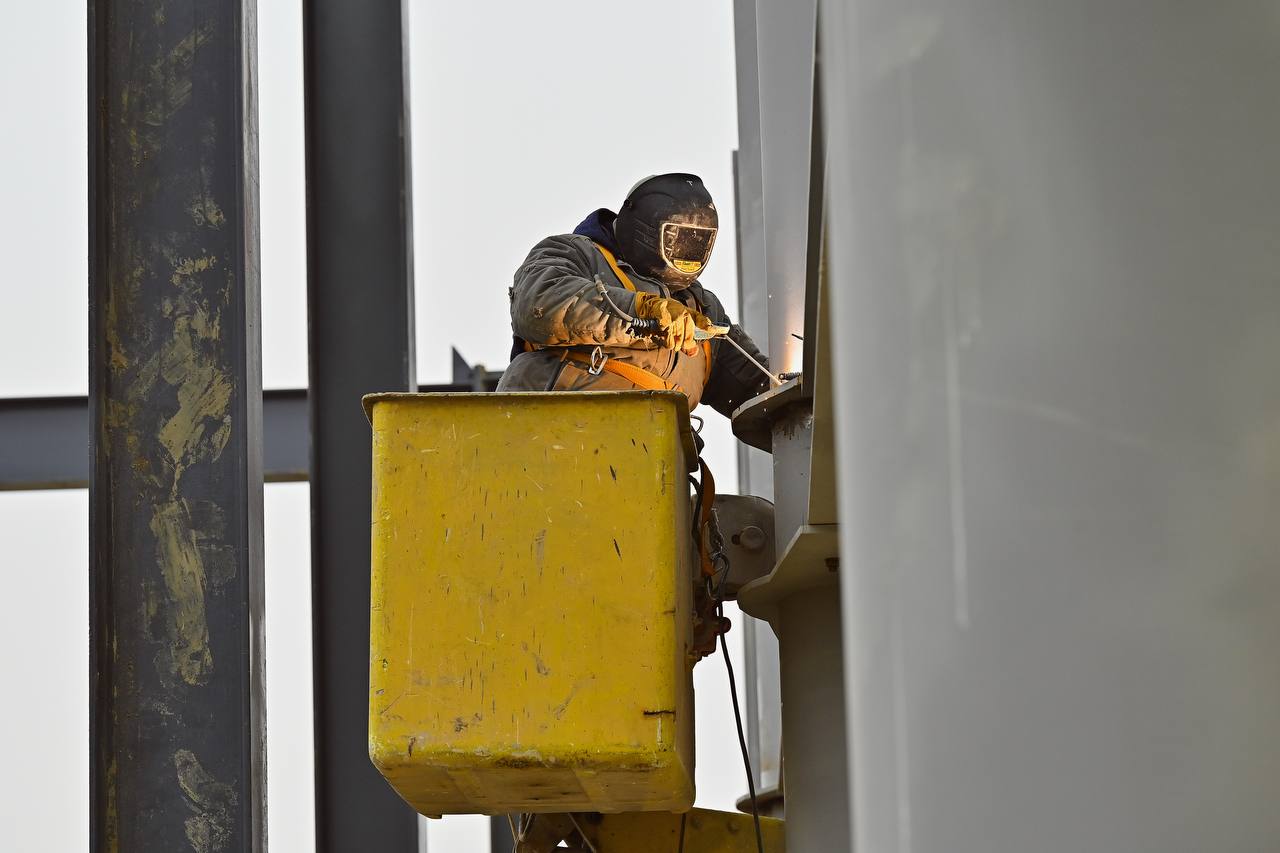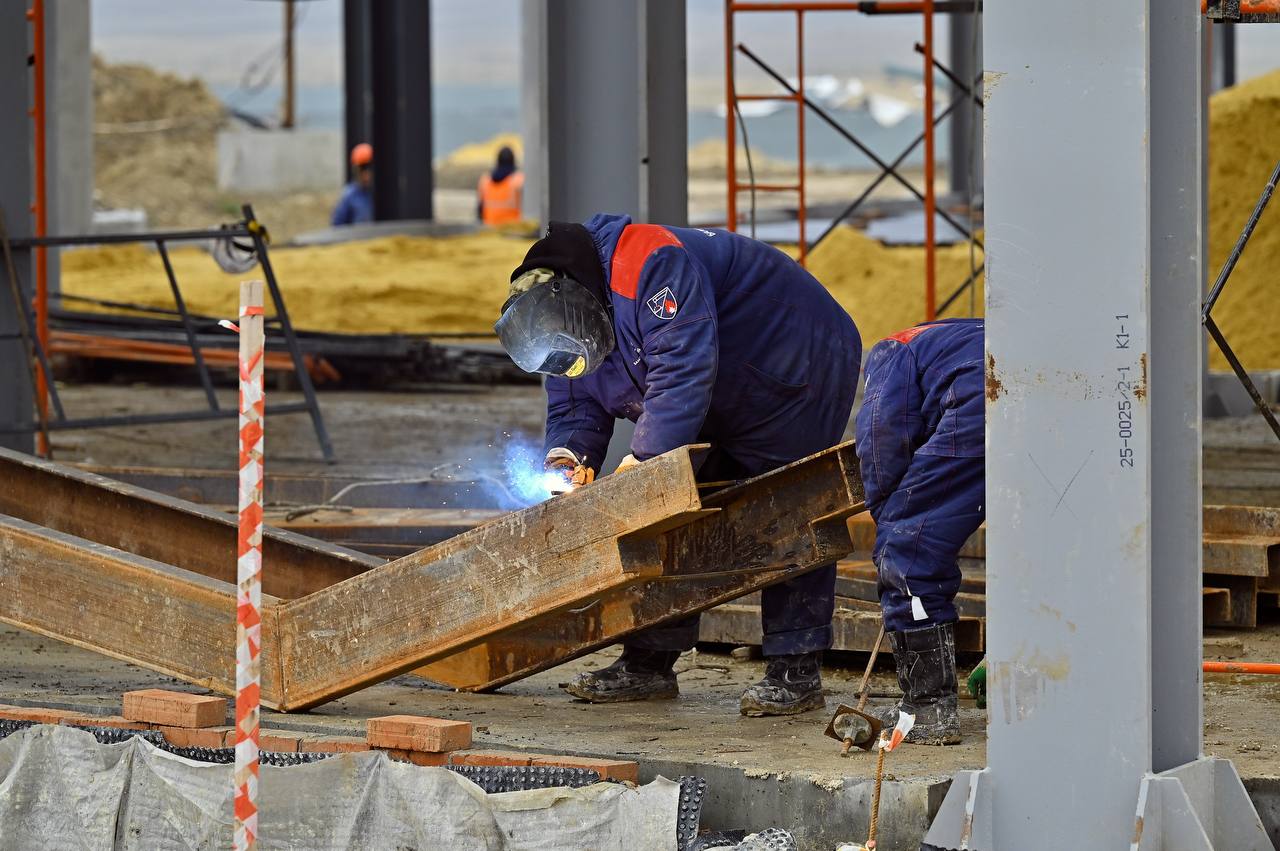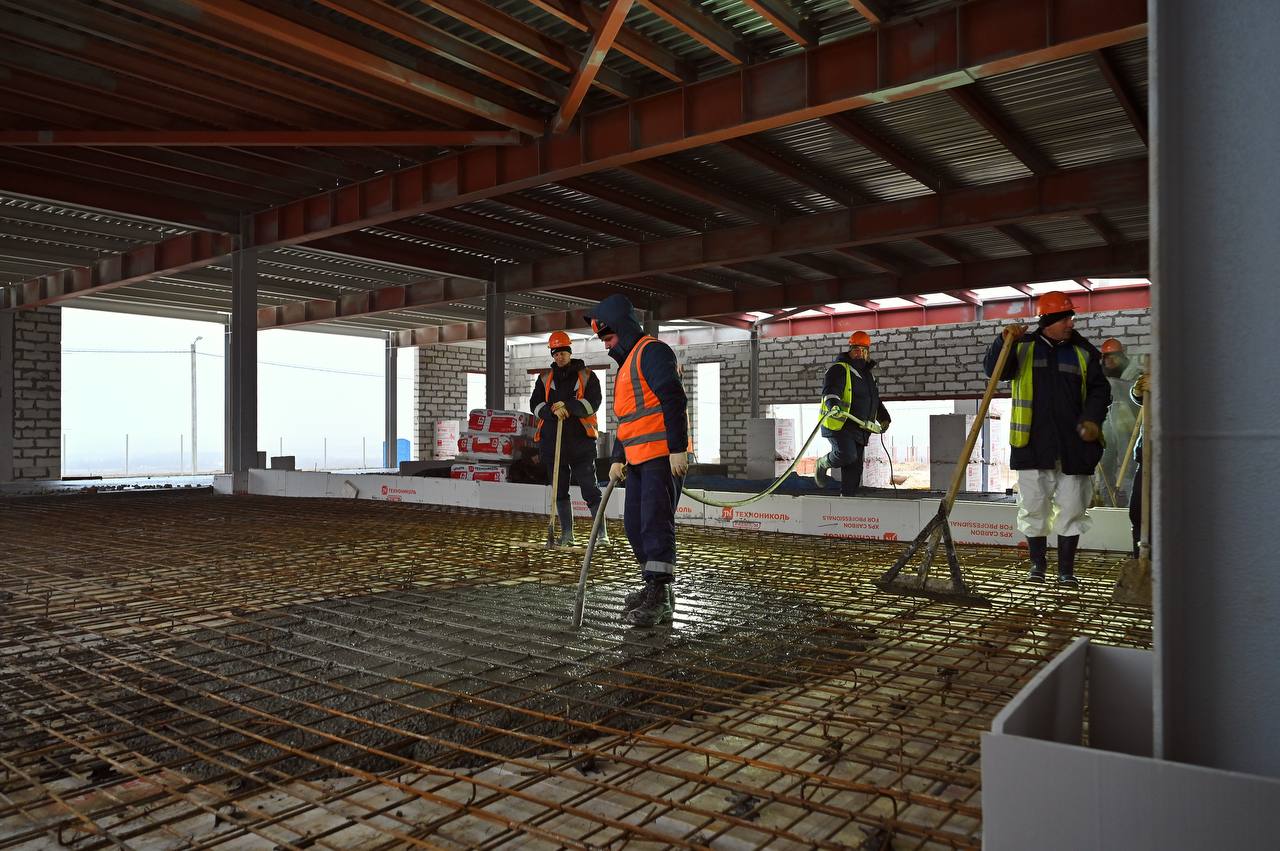 В настоящее время выполняются работы по возведению служебно-производственного здания: сварка металлоконструкций, бетонирование монолитной плиты пола, кирпичная кладка стен, кладка стен из газобетонных блоков
