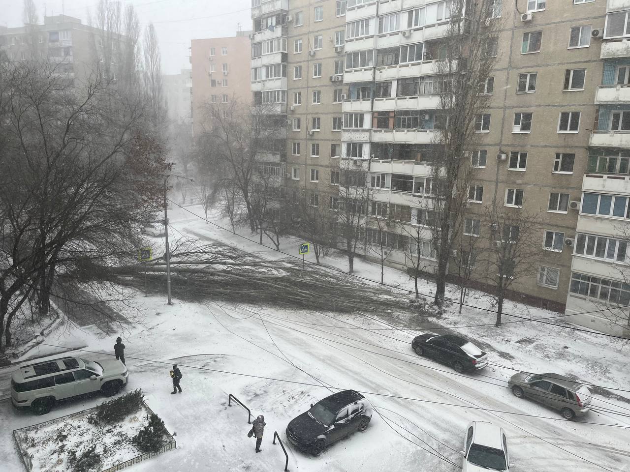Это произошло между домами 11/13 и 10/20. По словам очевидцев, пострадавших людей и машин нет. Оборвало провода, электричество не отключилось.