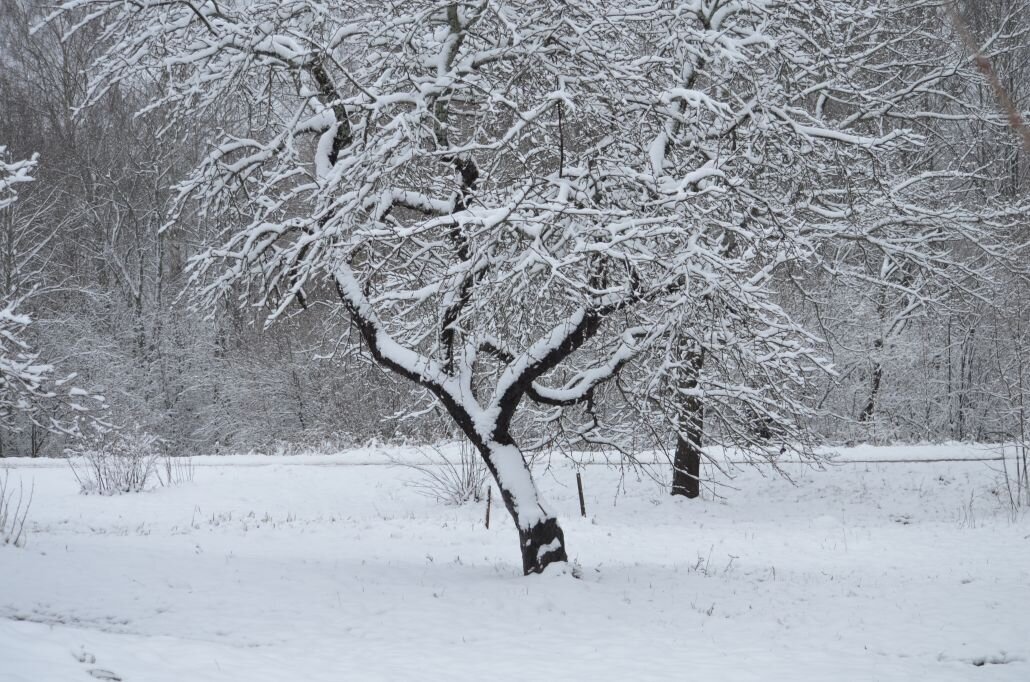 - Притаптывание снега: Один из наилучших способов защиты яблонь заключается в уплотнении снега вокруг их стволов. Утрамбованный снег под кроной деревьев не позволит мышам прокладывать ходы и повреждать кору. Кроме того, такой слой снега тает медленнее, что замедляет начало сокодвижения в дереве на 1-2 недели. Благодаря этому яблони будут цвести позже, сохраняя цветы от возможных весенних заморозков.