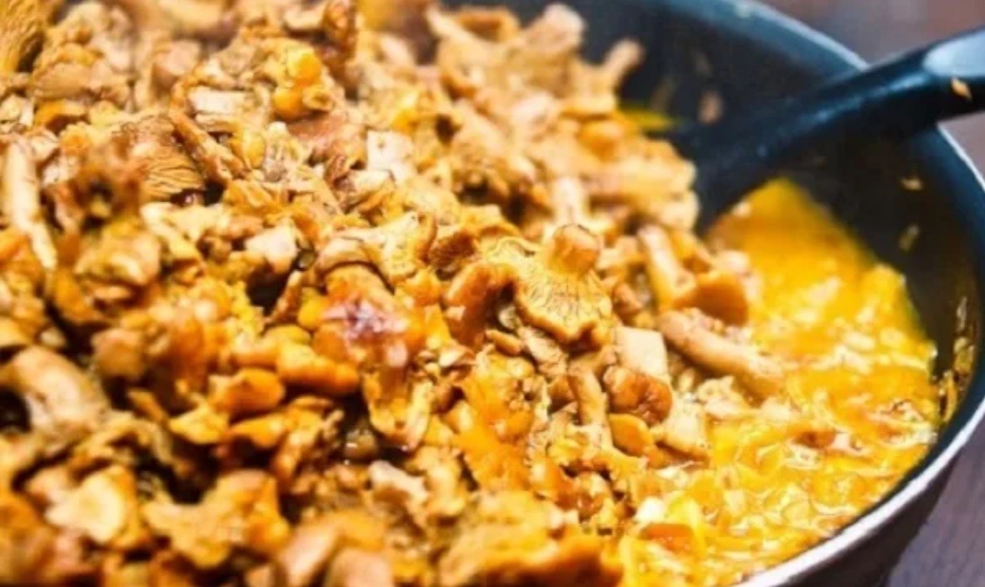 Для начала следует замочить лисички в холодной воде на 1 час. После этого грибы тщательно промываются и отвариваются в подсоленной воде в течение 3 минут. Затем их откидывают на дуршлаг, чтобы избавиться от лишней жидкости. Лисички нарезаются мелким кубиком и обжариваются на раскаленной сковороде с растительным маслом, приправляются солью и перцем.