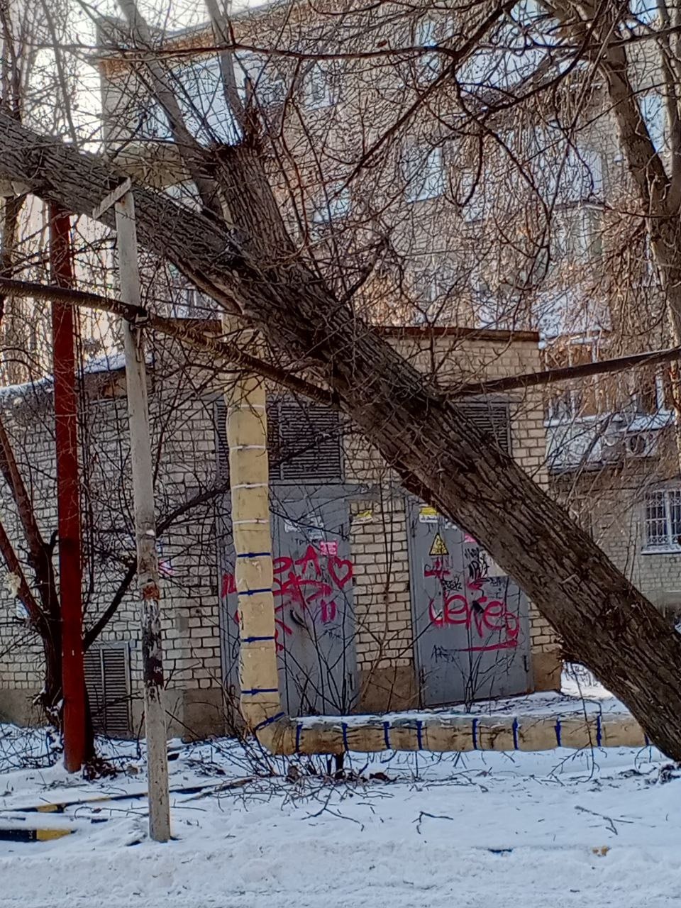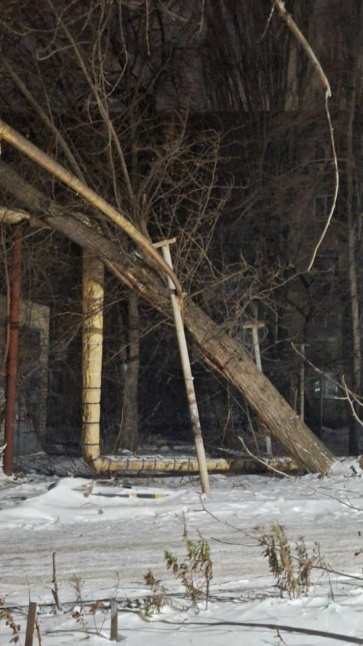 Жители дома №1 по улице Аэропорт рассказали "Саратов 24", что после сильного ветра 13 декабря на коммуникации во дворе упало дерево. Оно придавило газовую трубу, теплотрассу и низко висящие провода между домами.