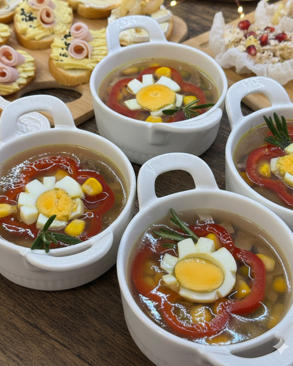 Когда язык остынет, его нарезают тонкими ломтиками и укладывают в порционные кокотницы или формочки. Яйца отваривают вкрутую, затем охлаждают и нарезают кружочками или фигурками. Болгарский перец режут на кольца или небольшие кубики. Все эти ингредиенты помещают в формы к языку, добавляя смесь консервированного горошка и кукурузы.