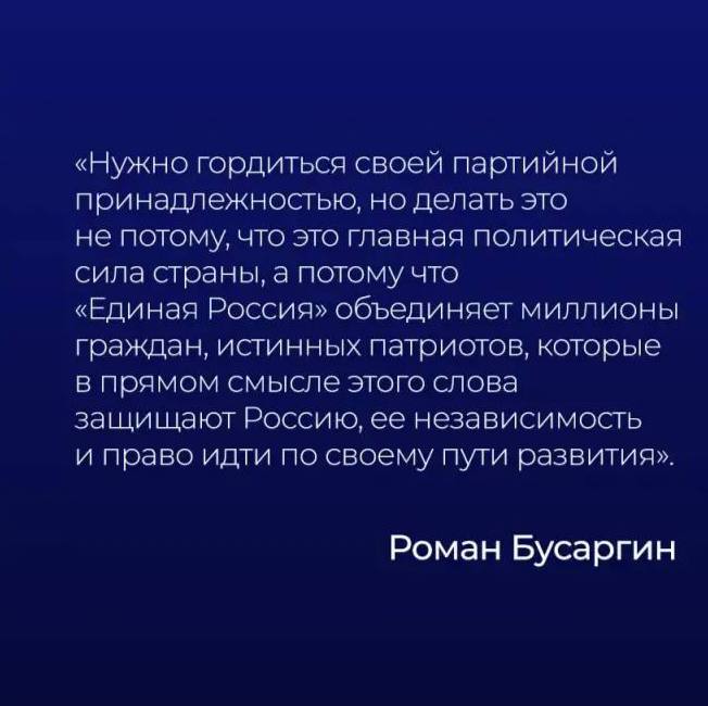«Каждый присутствующий здесь должен понимать и осознавать. Своей профессиональной деятельностью, проявлением активной гражданской позиции и политических взглядов, соучастием и вовлеченностью в решение важнейших задач вы представляете партию «Единая Россия». И быть частью этого - не привилегия, а большая ответственность, которая неразрывно связана с непрерывным трудом на наше общее благо, на благо России. Важно помнить, что нужно гордиться своей партийной принадлежностью, но делать это не потому, что это главная политическая сила страны, а потому, что «Единая Россия» объединяет миллионы граждан, истинных патриотов, которые в прямом смысле этого слова защищают Россию, ее независимость и право идти по своему пути развития».