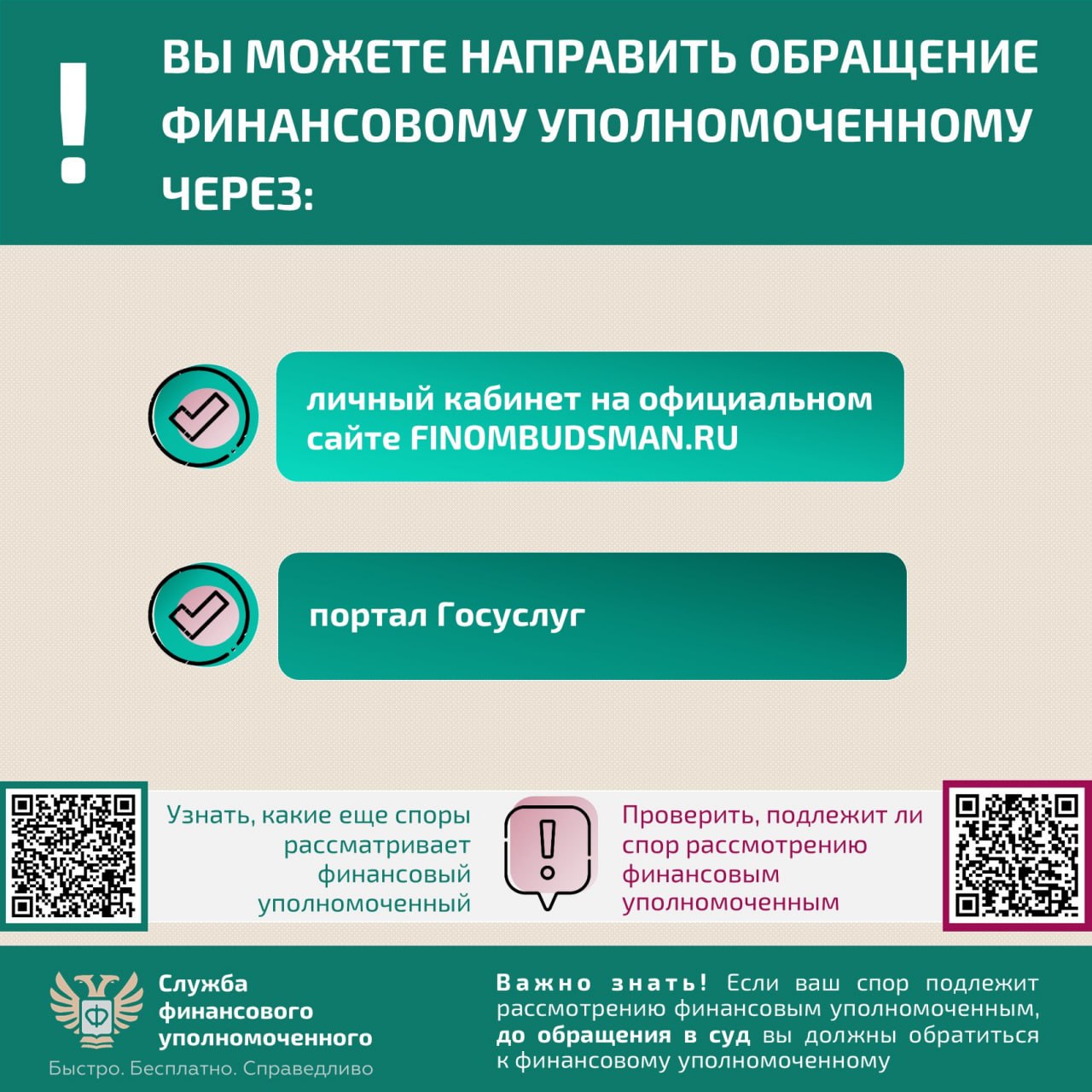 Напоминаем, что Служба финансового уполномоченного создана государством для бесплатной защиты прав потребителей финансовых услуг. Потребители финансовых услуг могут разрешить имущественные (денежные) споры со страховыми компаниями, банками, микрофинансовыми организациями, КПК, НПФами и ломбардами в досудебном порядке. Данный порядок является обязательным в силу Федерального закона «Об уполномоченном по правам потребителей финансовый услуг».