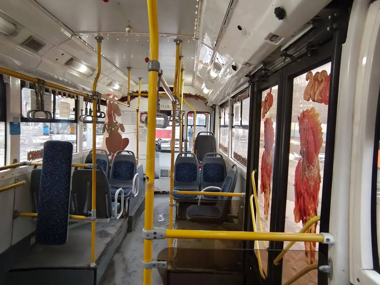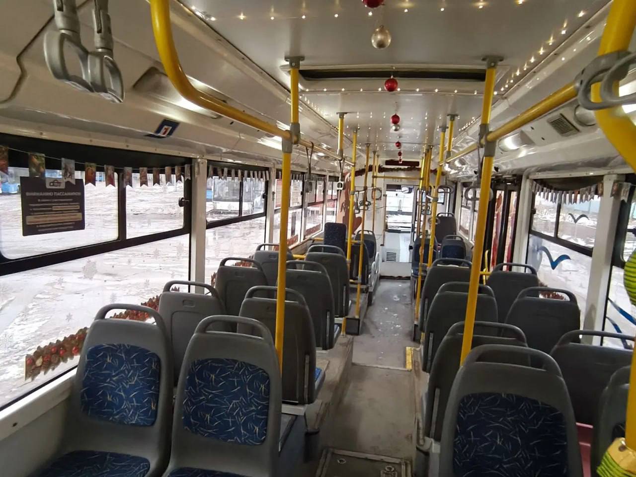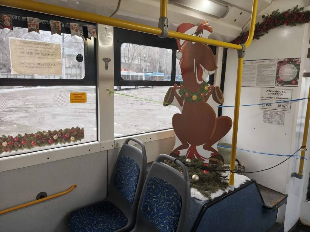 Салоны общественного транспорта украшены новогодней мишурой, рисунками, открытками и гирляндами. Помощь в их создании оказали школьники.