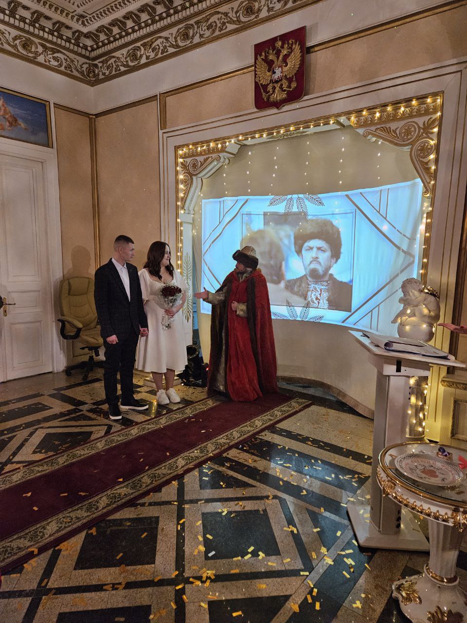 Гости попадали в зал Дворца бракосочетаний по билетам. Их вручали после небольшой викторины с кадрами из известных фильмов.