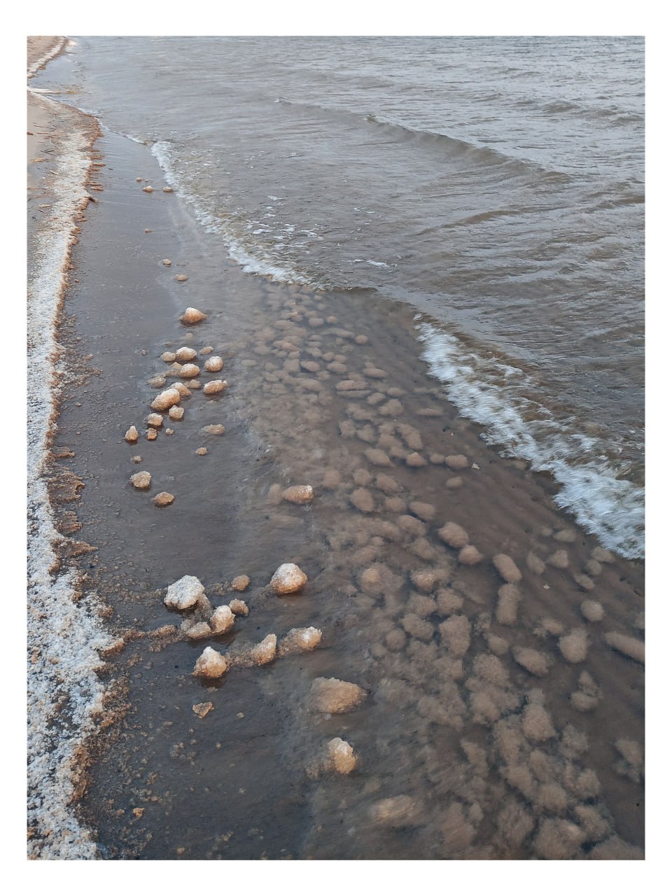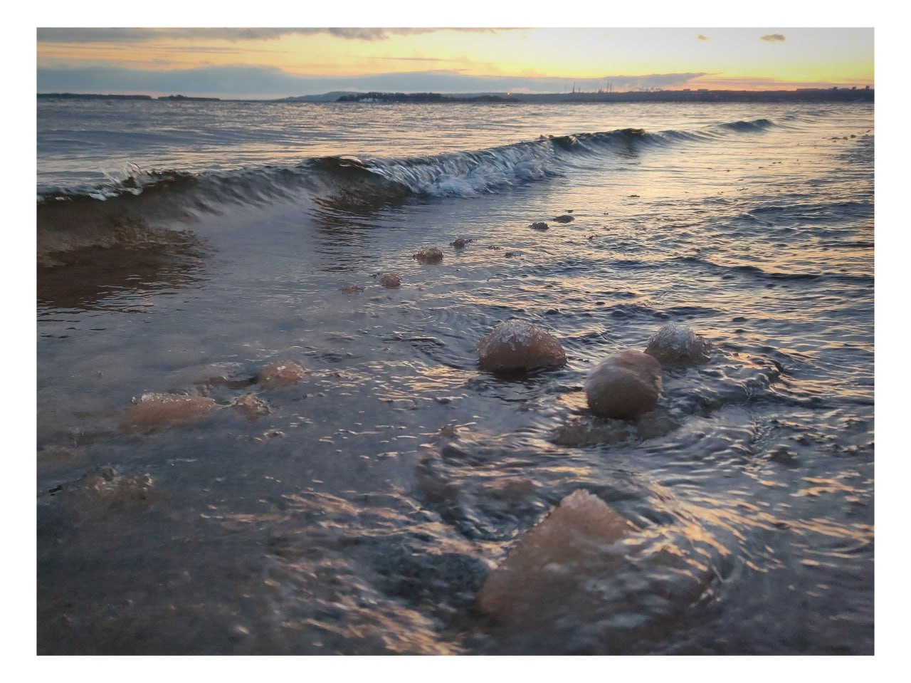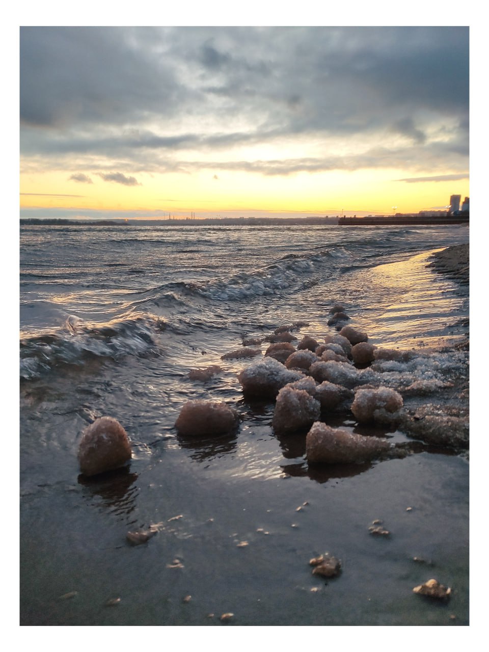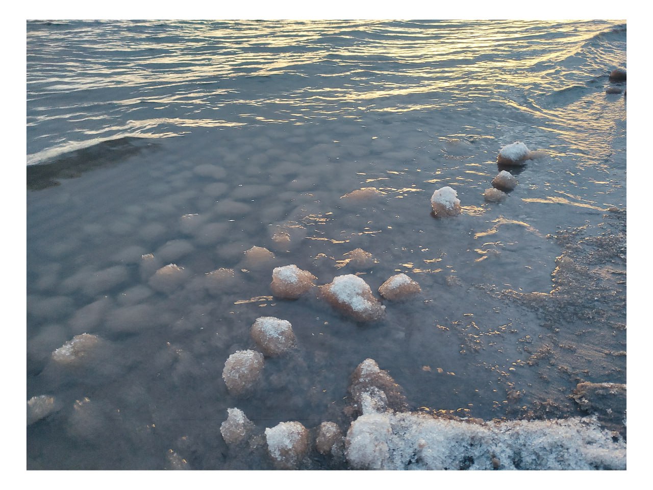Всё начинается с шуги – ледяной каши из мелких кристаллов, которая появляется в воде, когда воздух уже холодный, а вода ещё близка к нулю. Волны начинают «лепить» из нее комья, а потом обкатывать их о песчаное дно. Вращение в прибойной зоне и делает их округлыми.