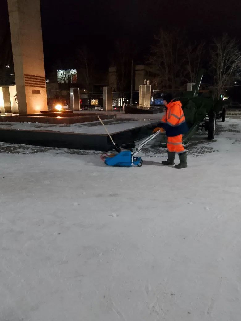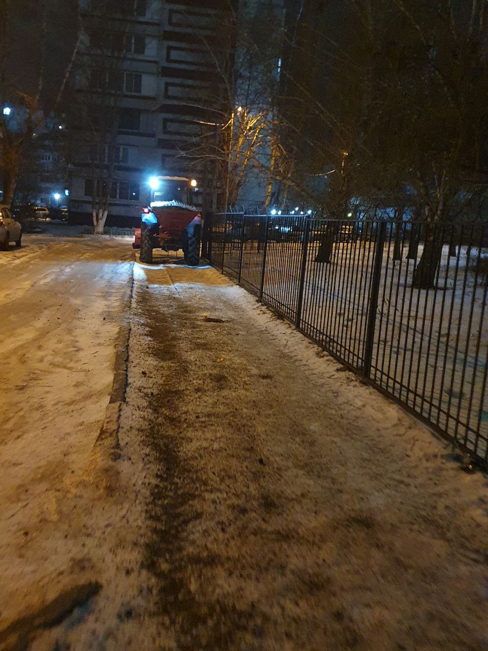 Сегодня ночью рабочие производили очистку и посыпку пескосоляной смесью дорог и тротуаров во всех частях города. Ночью работали 11 единиц техники, израсходовано 63 тонны пескосоляной смеси.