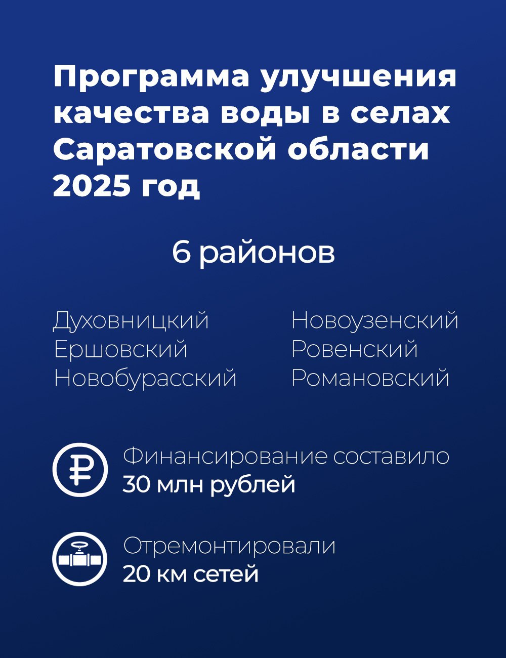В программе 2025 года участвовали 6 районов: Духовницкий, Ершовский, Новобурасский, Новоузенский, Ровенский, Романовский. В зависимости от потребности выполнялись работы по замене труб и насосного оборудования, установка автоматизированных станций управления погружными насосами, обновление запорной арматуры и т.д. Общая сумма финансирования составила 30 млн рублей. В общей сложности модернизировано 20 км сетей.