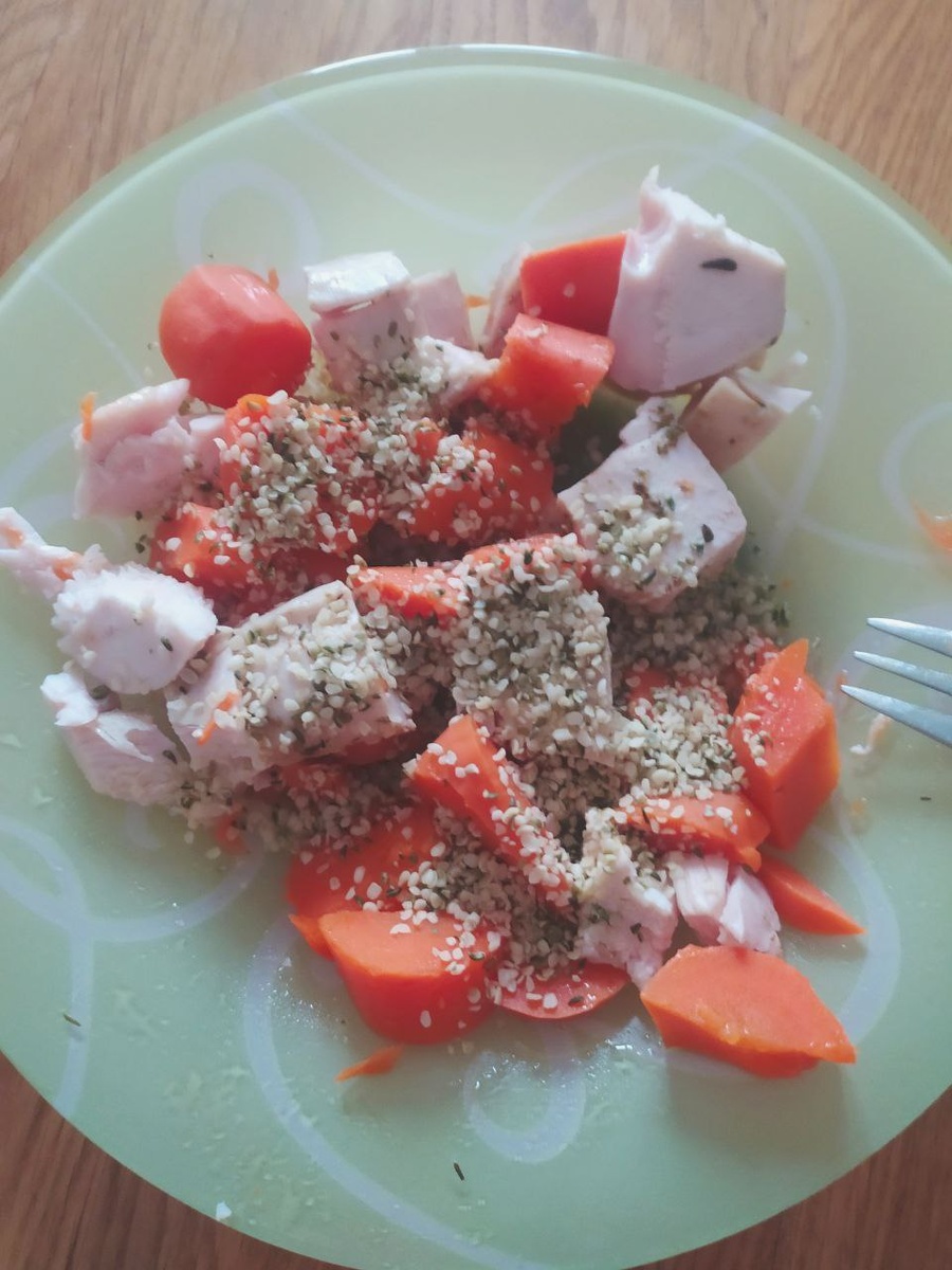 Чтобы приготовить это восхитительное угощение, достаточно отварить куриную грудку и морковь, а затем нарезать их на кусочки. В салатнице аккуратно перемешать курицу с морковью, добавить семена конопли и освежить всё соком лимона. Полить оливковым маслом и тщательно перемешать, пишет канал "Доктор Анастасия Яковлева".
