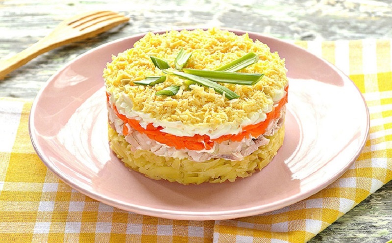 Процесс сборки требует немного терпения, но результат обязательно впечатлит. Основу составляет тёртый картофель, на который равномерно распределяется укроп с майонезом для дополнительного аромата. Далее выкладывается нарезанная копченая курица, а поверх — тонкий слой лука. В завершение последуют натертые морковь и белки яиц с желтками, создавая красивый жёлтый верх. Такой подход не только делает салат красивым, но и превращает его в настоящую кулинарную находку.