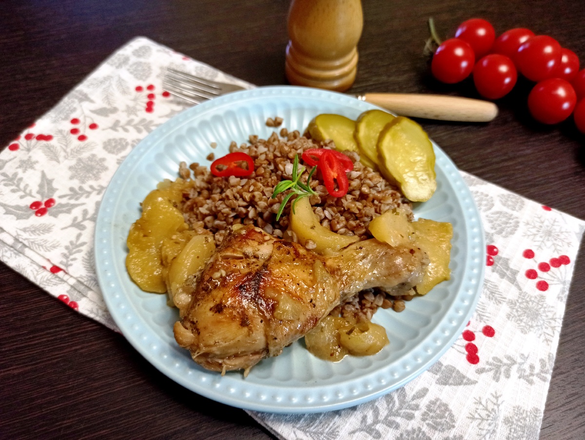 Тушите куриные ножки с яблоками под крышкой в течение 30-40 минут. Это позволит компонентам тщательно пропитаться и сливаться воедино. В качестве гарнира отлично подойдет гречка, которая гармонично дополнит блюдо. Также можно предложить к курице различные соленья, что создаст интересный контраст во вкусовой гамме.