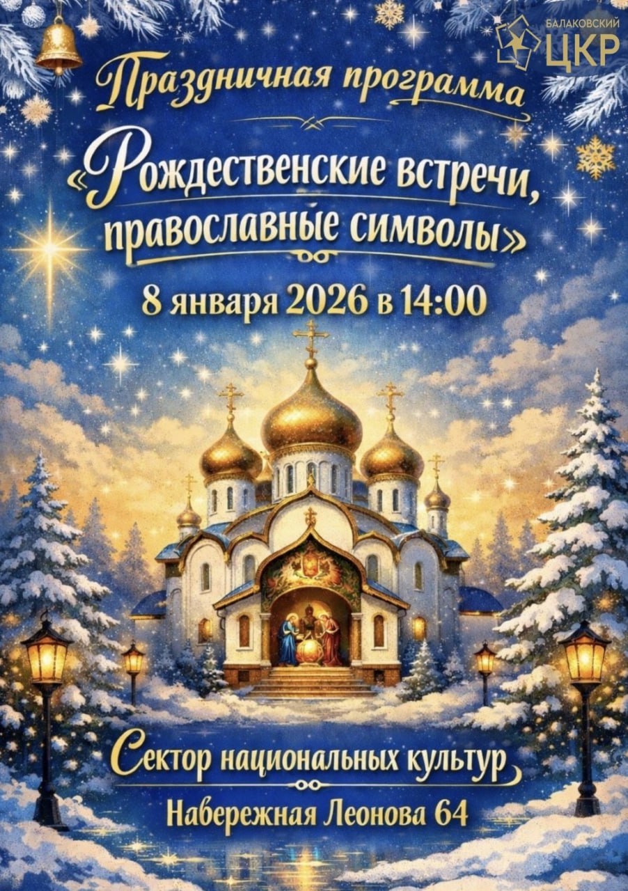 Праздничная программа "Рождественские встречи, православные символы" состоится 8 января в 14:00 в секторе национальных культур по адресу: ул. Набережная Леонова 64 (6-й микрорайон).