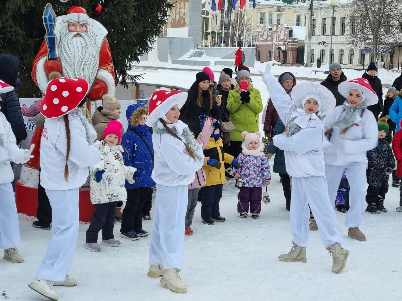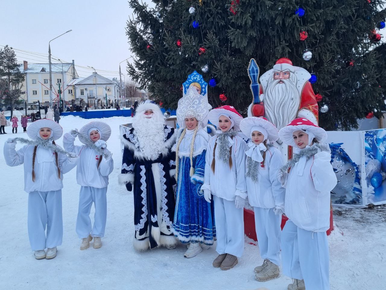 У главной новогодней ёлочки гостей и жителей города встречали сказочные персонажи, и, конечно же, Дедушка Мороз и Снегурочка!