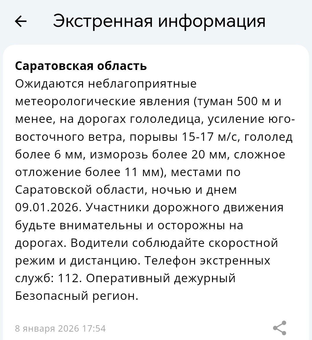 Экстренная информация РСЧС: Ожидаются неблагоприятные метеорологические явления (туман 500 м и менее, на дорогах гололедица, усиление юго-восточного ветра, порывы 15-17 м/с, гололед более 6 мм, изморозь более 20 мм, сложное отложение более 11 мм), местами по Саратовской области, ночью и днем 09.01.2026.