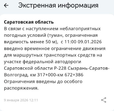 Экстренная информация РСЧС (Саратовская область): В связи с наступлением неблагоприятных погодных условий (туман, ограниченная видимость менее 50 м), с 11:00 09.01.2026 введено временное ограничение движения для маршрутных транспортных средств на участке федеральной автодороги Саратовской области Р-228 Сызрань-Саратов-Волгоград, км 317+000-км 672+386Ограничения введены до особого распоряжения.