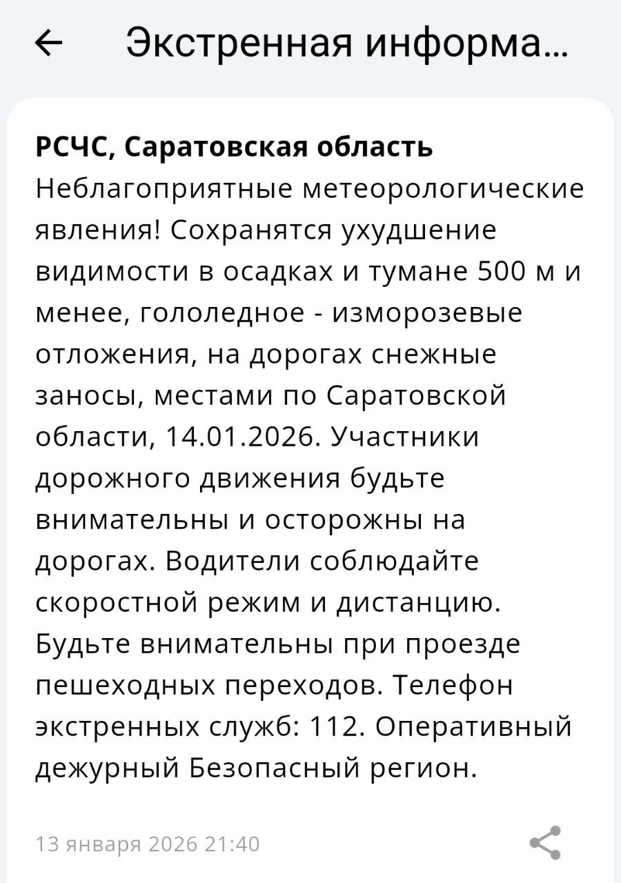 В Саратовской области завтра, 14 января, также ожидаются ухудшение видимости в осадках и тумане 500 метров и менее, гололедное - изморозевые отложения, на дорогах - снежные заносы.