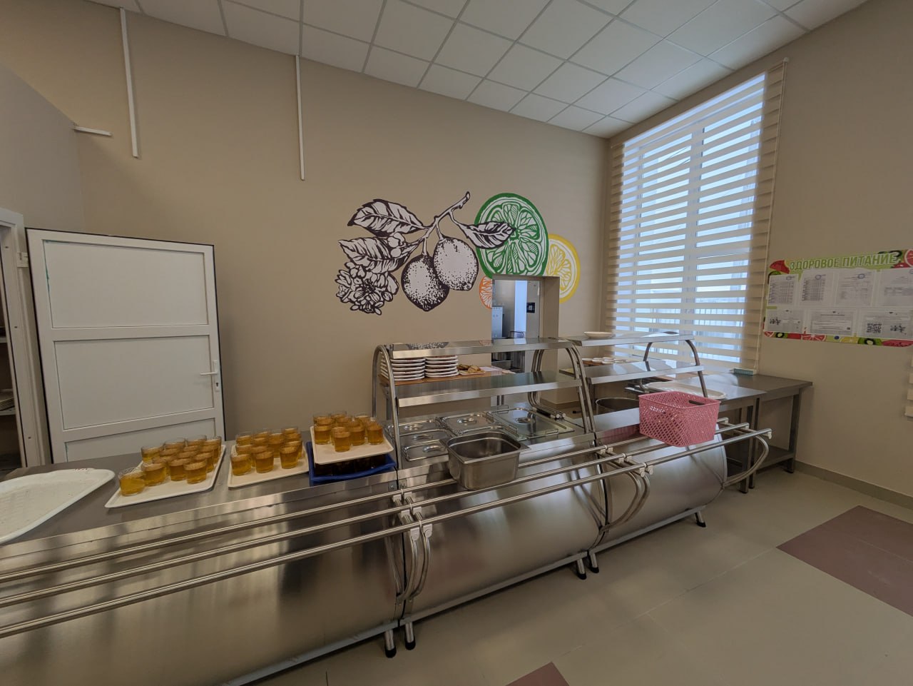 На кухню поставлен полный комплект современного оборудования – от плит до посудомоечной машины. Комплекс раздачи блюд с мармитами. В зале красивые удобные стулья и столы. У каждого ученика свое место за столом, чтобы не было хаоса при рассадке. На стене сделали стильное панно-натюрморт для улучшения аппетита. На нем так и написано: «Приятного аппетита».