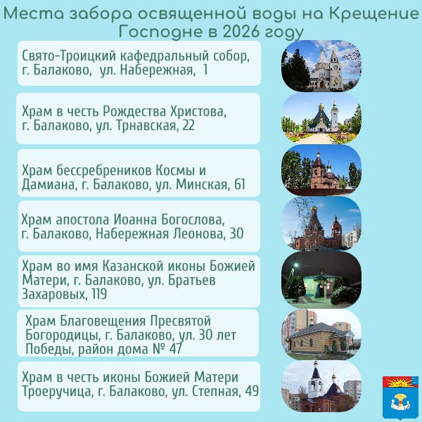 В карточках собрана информация о том, где можно будет набрать освященную воду в Балаковском муниципальном районе